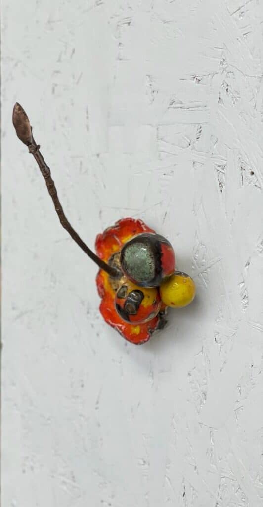 De verwijst naar het ontstaansproces, de fragiele maar krachtige eerste groei van iets nieuws. De combinatie van het dunne takje, de organische vormen en de warme, levendige kleuren moet een beeld oproepen van een leven dat ontwaakt, omringd door vruchtbare energie. Het werk is een momentopname van transformatie—tussen potentie en realisatie, tussen worteling en expansie.